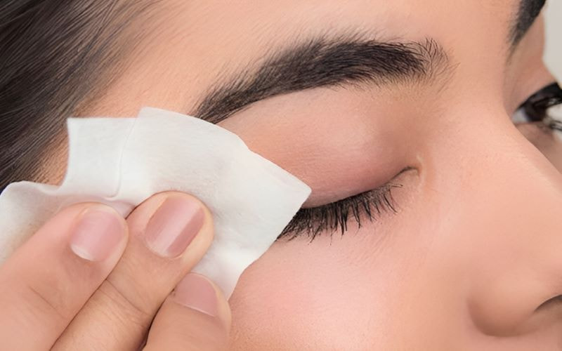 - Làm sạch vùng mắt: Sử dụng dung dịch tẩy trang chuyên dụng, nhẹ nhàng loại bỏ bụi bẩn, dầu thừa và lớp trang điểm trên vùng mắt. Bạn nên chọn sản phẩm tẩy trang không chứa dầu để tránh làm ảnh hưởng đến độ bám dính của keo nối mi.