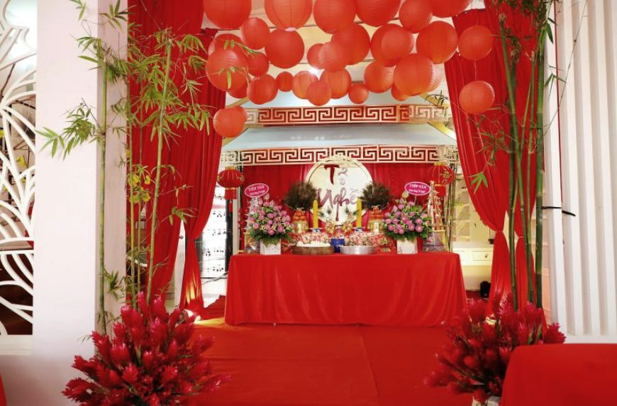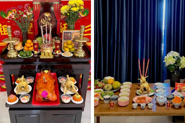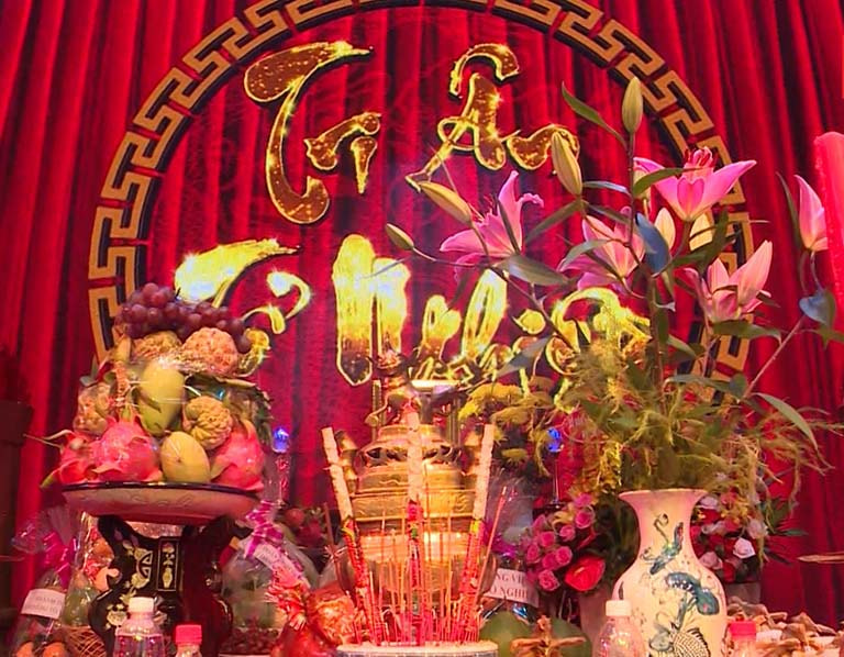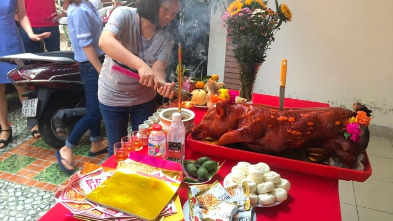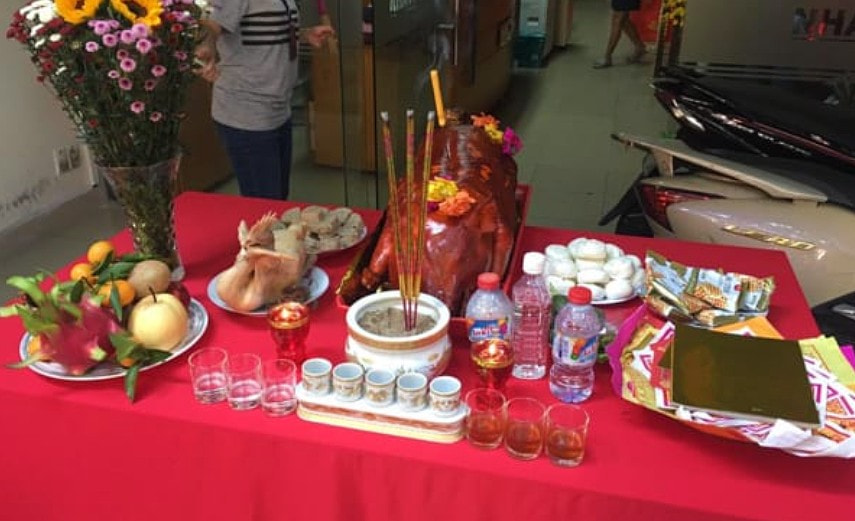 Bày mâm cúng: hoa, quả, nước, rượu, bát đũa,…