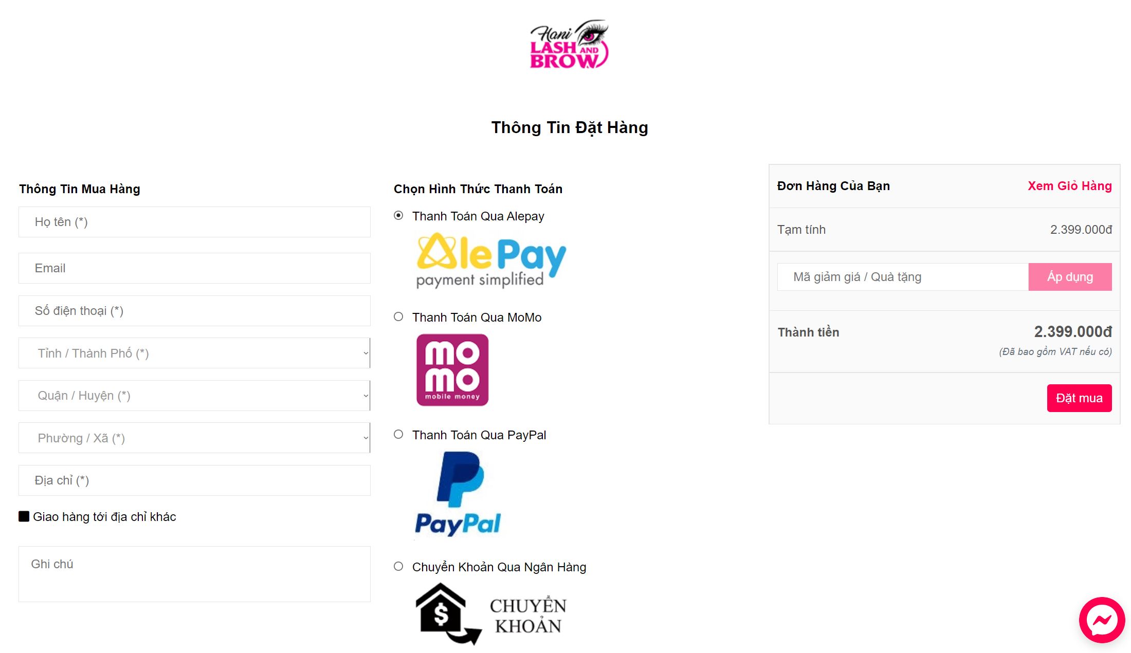 B3: Nhập thông tin người mua, chọn hình thức vận chuyển và hình thức thanh toán, nhấp vào Dặt Mua