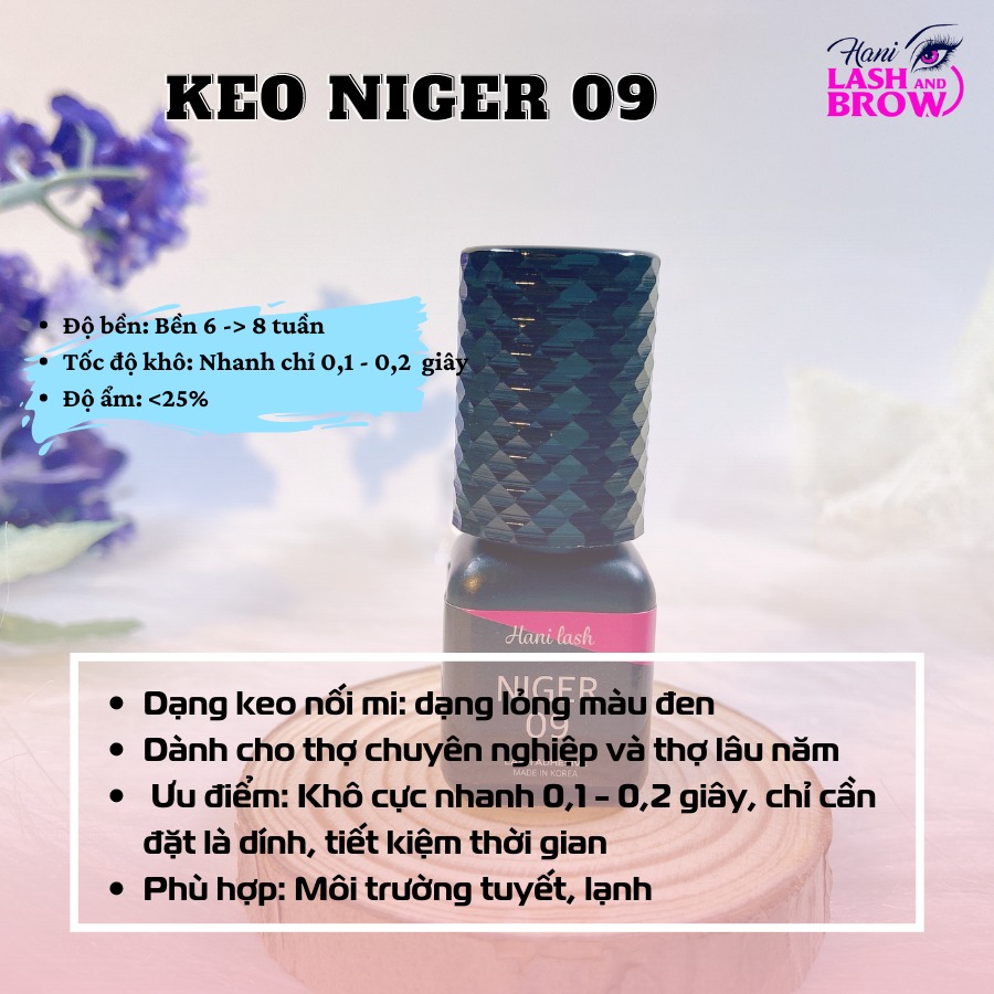 *** Nói chung ưu điểm của keo NIGER 09 là loại keo nối mi không cay, bền nhất, khô nhanh và an toàn .Dòng keo này chuyên dành cho thợ nối mi chuyên nghiệp có kinh nghiệm từ 1 năm trở lên. Thành phần của keo đã được kiểm nghiệm rất an toàn, hiệu quả. Sản phẩm hoàn toàn được gia công và nhập khẩu Chính Ngạch 100% từ Hàn Quốc.