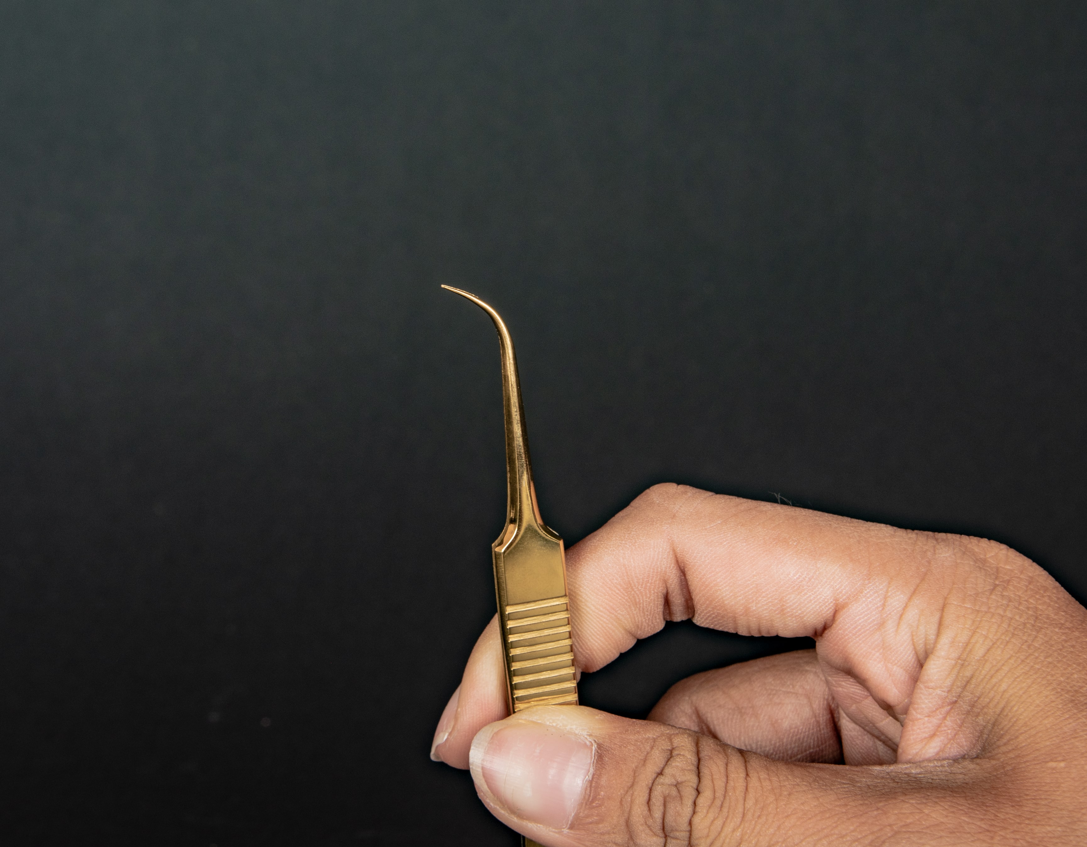 - Sử dụng ba ngón tay để cầm nhíp. Cụ thể ngón trỏ và ngón cái giữ nhíp. Dùng ngón giữa và ngón áp út để điều chỉnh nhíp.